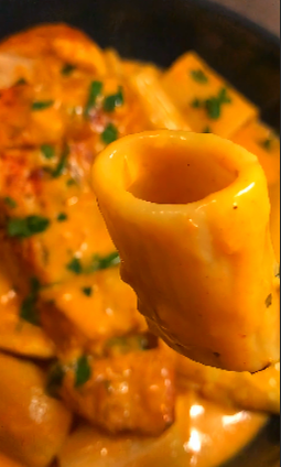 Les rigatoni jouent leur rôle à fond. Leur forme large retient la sauce, chaque bouchée est nappée, riche, satisfaisante. On n’est pas dans un plat sec ou vite mangé. C’est le genre de pâtes qu’on savoure, qu’on sert en portions généreuses, et qui donnent ce petit moment de silence autour de la table quand tout le monde commence à manger.